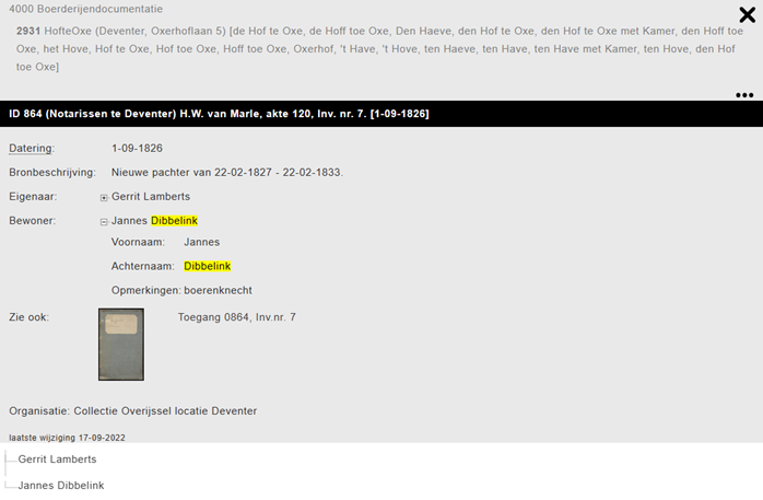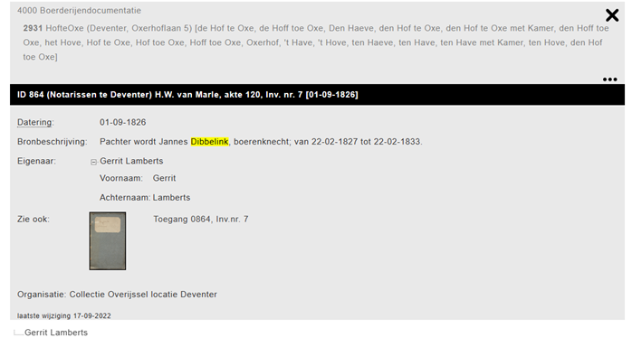 Jannes Dibbelink , geboren 1784 und Sohn von Gerardus Eskes Botterman – Dibbelink, ist Landarbeiter op Oxerlerhof 5. Später wurde er Pächter, heiratete Maria Dekker und sie bekamen 5 Kinder im Oxerlerhof.